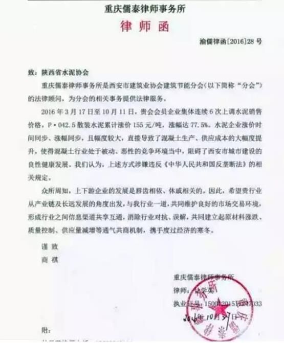 10月27日,鑒于陜西省內(nèi)水泥市場(chǎng)及混凝土市場(chǎng)發(fā)展情況,西安市建筑業(yè)協(xié)會(huì)建筑節(jié)能分會(huì)認(rèn)為這一市場(chǎng)情況違法了《中華人民共和國(guó)反壟斷法》的相關(guān)規(guī)定,并向陜西省水泥協(xié)會(huì)發(fā)律師函。希望水泥行業(yè)從產(chǎn)業(yè)鏈及長(zhǎng)遠(yuǎn)發(fā)展的角度出發(fā),與混凝土行業(yè)一道,共同維護(hù)良好的市場(chǎng)交易環(huán)境,形成行業(yè)之間信息渠道共享互通,消除行業(yè)對(duì)抗、誤解,共同建立起原材料漲跌,質(zhì)量控制、供應(yīng)量減增等通氣共商機(jī)制,攜手度過(guò)經(jīng)濟(jì)寒冬。