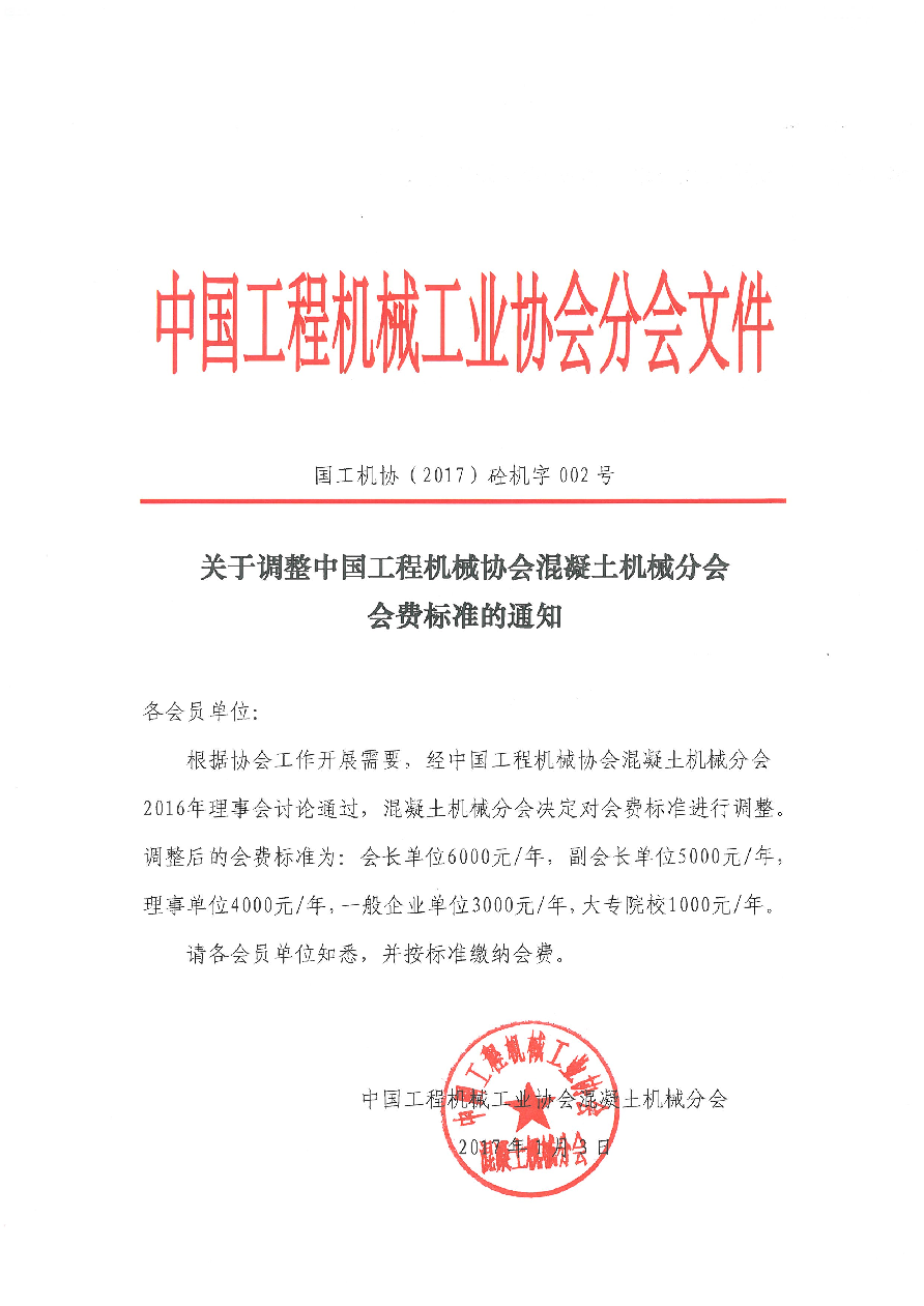 關(guān)于調(diào)整中國工程機械協(xié)會混凝土機械分會會費標準的通知
