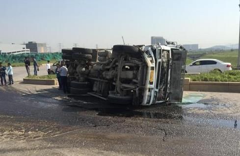 闖紅燈惹的禍?路口混凝土攪拌車與轎車相撞側(cè)翻