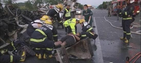 由于駕駛室變形嚴重,救援難度較大,為全力救出被困者,消防官兵首先利用擴張器從左側車門擴張,而后用撐頂桿對壓住被困者的變形車窗中間部位一點一點進行擴張,并小心翼翼地挪動被困者的身體,發(fā)現(xiàn)車門位置已經(jīng)變形卡主被困人員,現(xiàn)場指揮員果斷命令用無齒鋸對車門部位切割并用戰(zhàn)斗服蓋住被困人員防止燙傷,水槍一直保持充實水柱狀態(tài)。