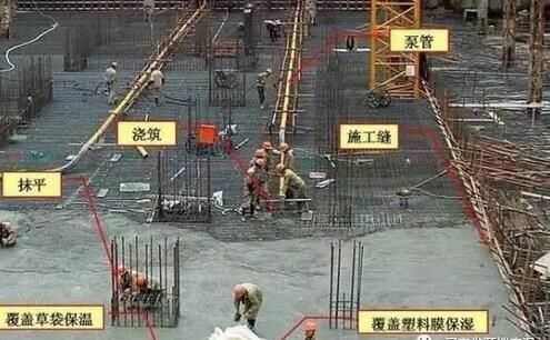 6、大體積泵送混凝土經振搗后表面水泥漿較厚,容易引起表面裂縫。首先,要求在振搗最上一層混凝土時,控制振搗時間,注意避免表層產生太厚的浮漿層;在澆搗后,必須及時用2m 長括尺,將多余浮漿層刮除,按照標高控制點,將混凝土表面括拍平整。有凹坑的部位必須用混凝土填平,在混凝土收漿接近初凝時,混凝土面進行二次抹光,用木蟹全面仔細打抹兩遍,既要確?;炷恋钠秸龋忠哑涑跗诒砻娴氖湛s脫水細縫閉合,在混凝土收漿凝固施工期間,除了具體施工人員外,不得在未干硬的混凝土面上隨意行走,收漿工作完成的面必須同步及時覆蓋薄膜。