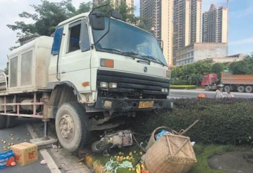在泵車(chē)前的綠化帶上,散落著兩個(gè)大竹筐,筐內(nèi)裝著水果,路面遺落一雙拖鞋、一個(gè)破碎的安全頭盔及眾多摩托車(chē)零部件。