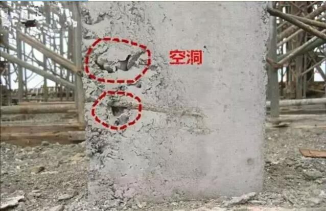 由于混凝土灌注時(shí)有一些部位堵塞不通,構(gòu)件中就會(huì)產(chǎn)生空洞,空洞不同與蜂窩,蜂窩的特征是存在于未搗實(shí)的混凝土或缺水泥漿;而空洞卻是局部或全部沒有混凝土??斩吹某叨韧ǔ]^大,以至于鋼筋全部裸露,造成構(gòu)件內(nèi)貫通的斷缺以至于結(jié)構(gòu)發(fā)生整體性破壞。