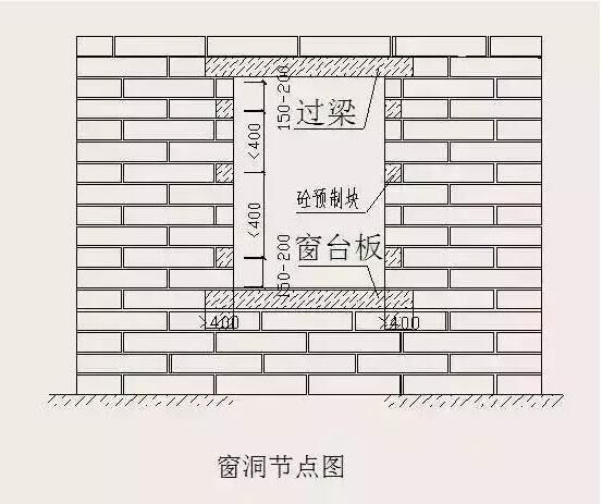 當(dāng)外墻為砌體時(shí),須在外門窗洞兩側(cè)預(yù)埋C20混凝土塊(有混凝土企口情況除外),以便固定窗框(或副框)?;炷翂K寬度同墻厚,高度應(yīng)與砌塊同高或砌塊高度的1/2且不小于100mm,長度不小于200mm,最上部(或最下部)的混凝土塊中心距洞口上下邊的距離為150~200mm,其余部位的中心距不大于400mm,且均勻分布。嚴(yán)禁采用預(yù)埋木磚固定門窗。