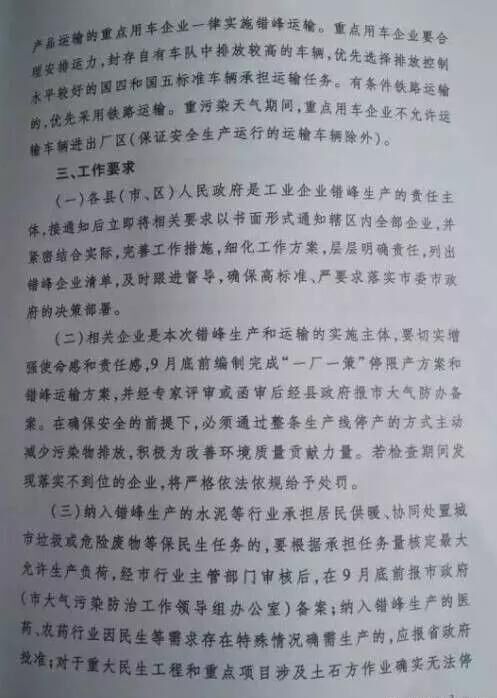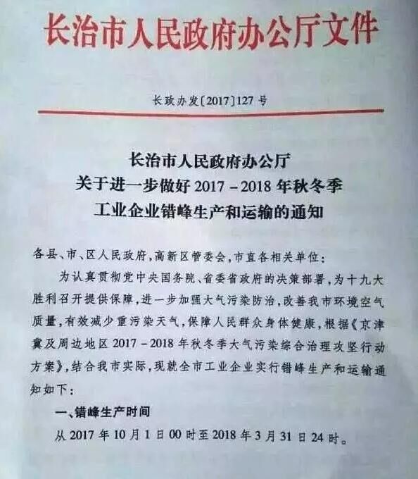 山西省長治市也發(fā)布《關(guān)于進(jìn)一步做好2017-2018秋冬季工業(yè)企業(yè)錯(cuò)峰生產(chǎn)和運(yùn)輸?shù)耐ㄖ?。要求?017年10月1日00時(shí)起至2018年3月31日24時(shí),水泥(含粉磨站)等建材行業(yè)企業(yè)全部停產(chǎn)。