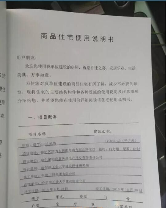 在哈爾濱市城鄉(xiāng)建設(shè)委員會官方網(wǎng)站上,記者查到了“招商諾丁山 05 地塊 8#樓”的《哈爾濱市工程竣工驗(yàn)收備案證》,備案號為黑建備字號2015380,建設(shè)單位為哈爾濱招商嘉天房地產(chǎn)開發(fā)有限責(zé)任公司,施工單位為中建三局集團(tuán)有限公司,監(jiān)理單位為哈爾濱工業(yè)大學(xué)建設(shè)項(xiàng)目管理公司,開竣工日期為2014年6月15日-2015年12月18日,備案日期2015年12月18日。