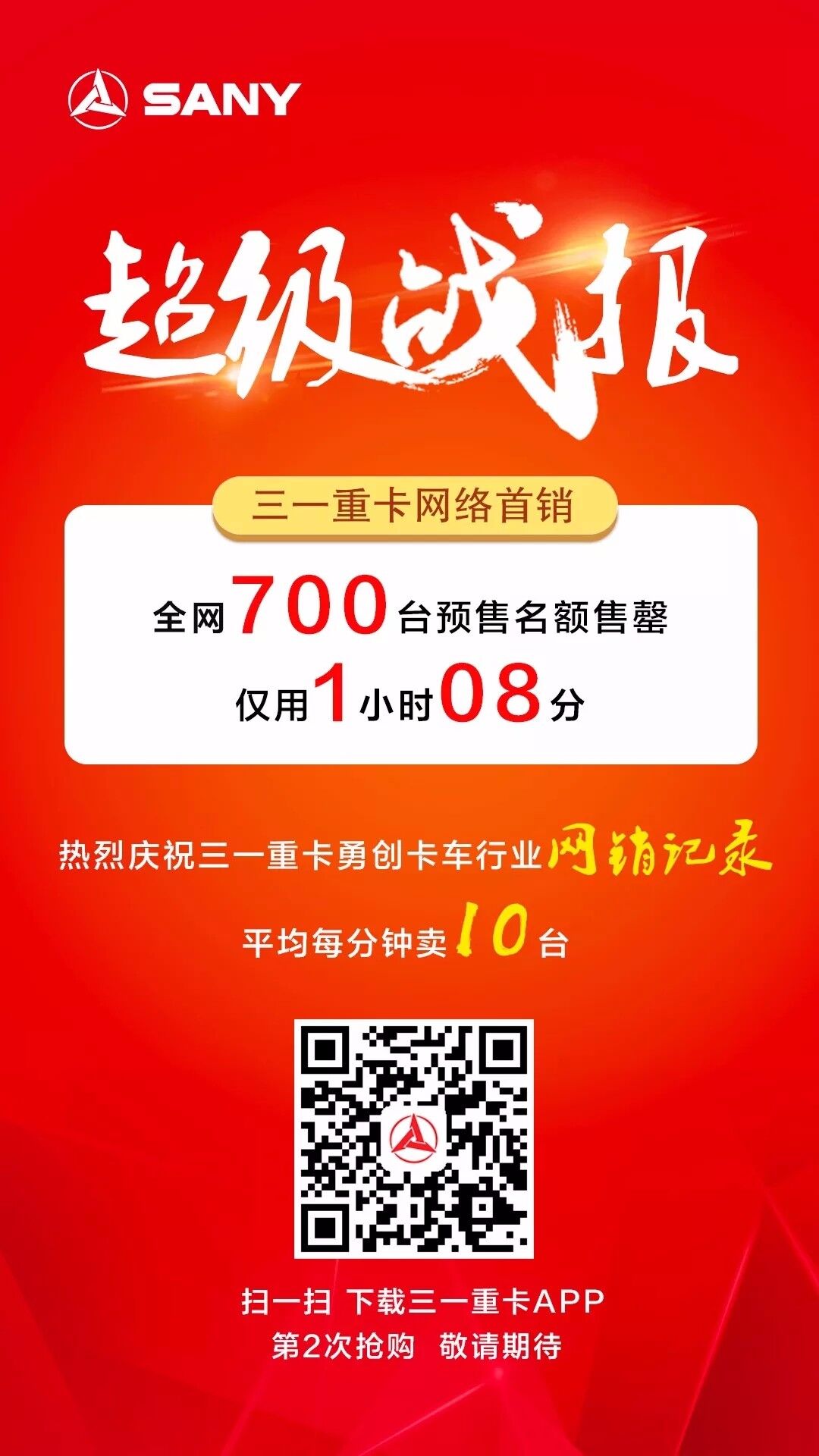 導(dǎo)語:2018年3月31日,三一重卡首批700臺(tái)預(yù)售名額在網(wǎng)絡(luò)上鳴鑼開賣,僅用1小時(shí)8分鐘,700臺(tái)預(yù)售名額搶購一空,不僅開創(chuàng)了重卡廠家網(wǎng)絡(luò)直銷的先河,更是創(chuàng)造了重卡互聯(lián)網(wǎng)銷售臺(tái)數(shù)和總金額的雙重紀(jì)錄!