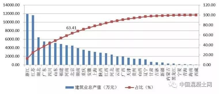 除浙江、江蘇兩省外,總產(chǎn)值超過(guò)4000億元的還有湖北、廣東、四川、山東、福建、河南和北京共7個(gè)地區(qū),上述9省市完成的建筑業(yè)總產(chǎn)值占全國(guó)建筑業(yè)總產(chǎn)值的63.41%(圖1)。