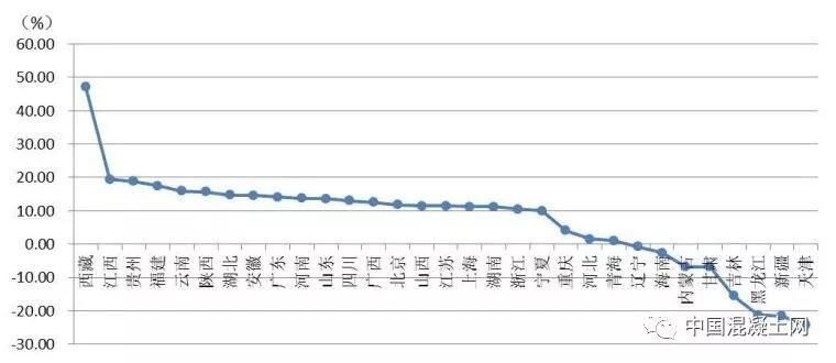 從各地區(qū)建筑業(yè)總產(chǎn)值增長(zhǎng)情況看,有23個(gè)地區(qū)的建筑業(yè)總產(chǎn)值較上年同期有不同幅度的增長(zhǎng)。其中,西藏、江西、貴州、福建、云南、陜西的增幅均超過(guò)15%。有8個(gè)地區(qū)出現(xiàn)負(fù)增長(zhǎng),其中,天津、新疆、黑龍江、吉林出現(xiàn)了15%以上的負(fù)增長(zhǎng)(圖2)。