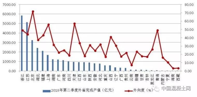 圖4 2018年上半年各地區(qū)跨省完成的建筑業(yè)總產(chǎn)值及外向度