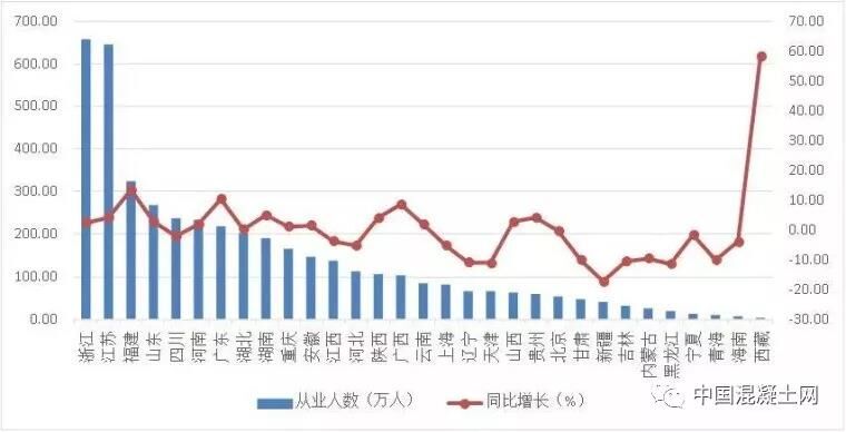 2018年上半年,全國(guó)建筑業(yè)從業(yè)人數(shù)超過(guò)百萬(wàn)的地區(qū)共15個(gè)。浙江、江蘇依然是從業(yè)人數(shù)大省,人數(shù)分別達(dá)到658.04萬(wàn)人和643.60萬(wàn)人。福建、山東、四川、河南、廣東、湖北等6省從業(yè)人數(shù)均超過(guò)200萬(wàn)人。與上年同期相比,16個(gè)地區(qū)的從業(yè)人數(shù)增加,其中,增加人數(shù)最多的是福建,增加38.15萬(wàn)人;15個(gè)地區(qū)的從業(yè)人數(shù)減少,其中,減少最多的是新疆,減少8.76萬(wàn)人。從業(yè)人數(shù)增幅最大的是西藏,達(dá)到58.09%;增幅最小的是新疆,下降了17.44%(圖5)。