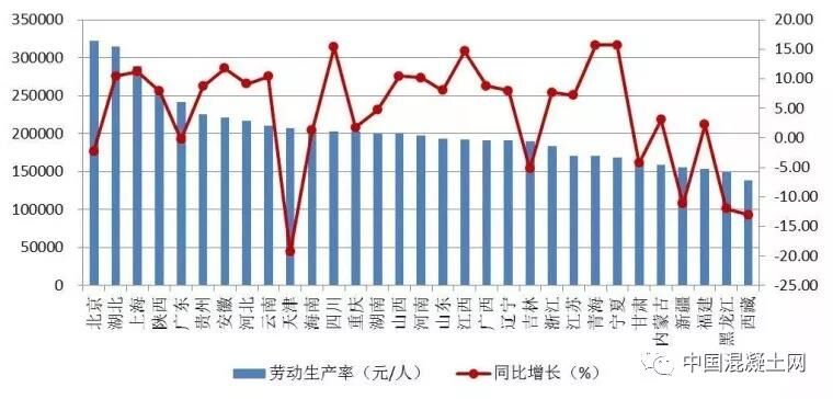 2018年上半年,按建筑業(yè)總產(chǎn)值計(jì)算的勞動(dòng)生產(chǎn)率有23個(gè)地區(qū)保持增長(zhǎng),8個(gè)地區(qū)有所降低。勞動(dòng)生產(chǎn)率排序前三位的地區(qū)是北京、湖北和上海,分別為321915元/人、314596元/人和289287元/人,分別比上年同期增長(zhǎng)了-2.29%、10.48%和11.19%。勞動(dòng)生產(chǎn)率增幅超過(guò)10%的有寧夏、青海、四川、江西、安徽、上海、湖北、山西、云南和河南10個(gè)省區(qū)(圖6)。