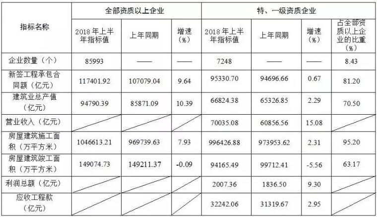 住房和城鄉(xiāng)建設(shè)部匯總的7248個(gè)特、一級(jí)資質(zhì)建筑業(yè)企業(yè)2018年上半年主要指標(biāo)數(shù)據(jù)如下(表1)。