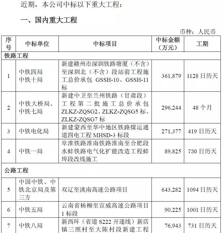 452億元!中國(guó)中鐵重大工程中標(biāo)公告