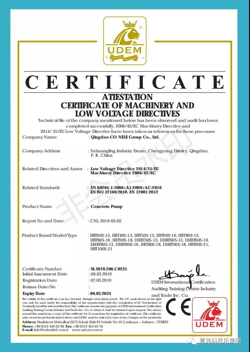 陽春三月,微風(fēng)習(xí)習(xí),科尼樂集團(tuán)的明星產(chǎn)品混凝土泵、混凝土布料機(jī)順利通過了歐盟CE認(rèn)證,這也代表著科尼樂集團(tuán)在提升產(chǎn)品品質(zhì)、拓展銷路、提升企業(yè)競(jìng)爭(zhēng)力方面邁入了新臺(tái)階。