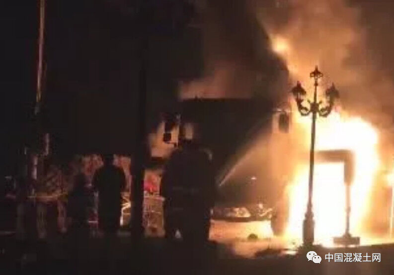 起火的混凝土泵車(chē)四個(gè)支撐柱張開(kāi),輸送混凝土的曲臂也伸展開(kāi)來(lái),整個(gè)車(chē)身被熊熊的大火包圍。泵車(chē)油箱破裂,大量的柴油外漏,現(xiàn)場(chǎng)卷起了5米多高的火舌。