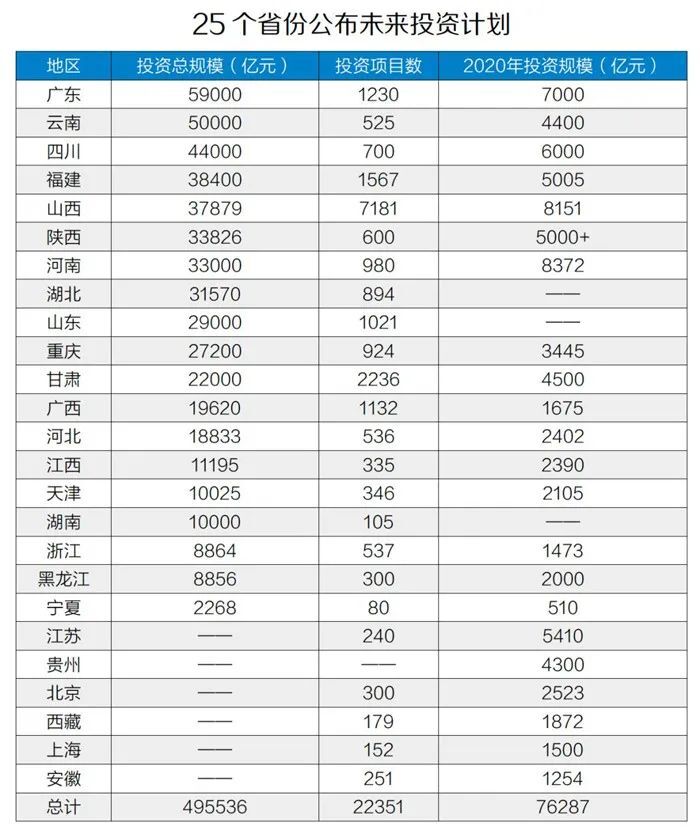 記者不完全統(tǒng)計(jì)發(fā)現(xiàn),截至3月10日,有25個(gè)省區(qū)市公布了未來(lái)的投資規(guī)劃,2.2萬(wàn)個(gè)項(xiàng)目總投資額達(dá)49.6萬(wàn)億元,其中2020年度計(jì)劃投資總規(guī)模7.6萬(wàn)億元。