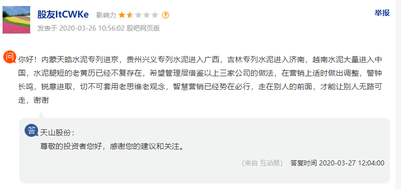同期有投資者在上市平臺向天山股份董秘提問并建議說:內(nèi)蒙天皓水泥專列進京,貴州興義專列水泥進入廣西,吉林專列水泥進入濟南,越南水泥大量進入中國,水泥腿短的老黃歷已經(jīng)不復(fù)存在,希望管理層借鑒以上三家公司的做法,在營銷上適時做出調(diào)整,警鐘長鳴,銳意進取,切不可套用老思維老觀念,智慧營銷已經(jīng)勢在必行,走在別人的前面,才能讓別人無路可走。