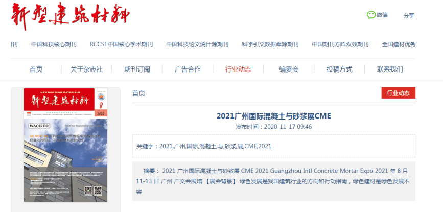 廣州國際混凝土及砂漿展已于2020年成功舉辦,自項(xiàng)目立項(xiàng)以來,得到多方媒體的關(guān)注和報(bào)道。據(jù)統(tǒng)計(jì),2020-2021年度,騰訊視頻、愛奇藝、土豆網(wǎng)、優(yōu)酷視頻等電視媒體,網(wǎng)易房產(chǎn)、新浪家居、廣州搜狐焦點(diǎn)、騰訊網(wǎng)、中國數(shù)字經(jīng)濟(jì)網(wǎng)、央廣網(wǎng)、360慧聰網(wǎng)、南方網(wǎng)、北方網(wǎng)、羊城晚報(bào)、廣州日?qǐng)?bào)、新浪網(wǎng)、新京報(bào)、21世紀(jì)經(jīng)濟(jì)報(bào)道、東方網(wǎng)、光明網(wǎng)、中國商業(yè)新聞網(wǎng)、焦點(diǎn)中國網(wǎng)等主流媒體,抖音、快手、西瓜視頻、今日頭條、百家號(hào)、火山小視頻等視頻媒體和廣東建設(shè)報(bào)、中國路面機(jī)械網(wǎng)、新型砂漿網(wǎng)、世界機(jī)械網(wǎng)、工程機(jī)械在線、攪拌設(shè)備網(wǎng)、中國保溫砂漿網(wǎng)等行業(yè)媒體,以及《混凝土雜志》、《砼時(shí)代》等雜志媒體均對(duì)展會(huì)給予高度關(guān)注,積極宣傳展會(huì)動(dòng)態(tài)與資訊。感謝各行業(yè)媒體、主流媒體、視頻媒體、雜志的大力支持與高度認(rèn)可。
