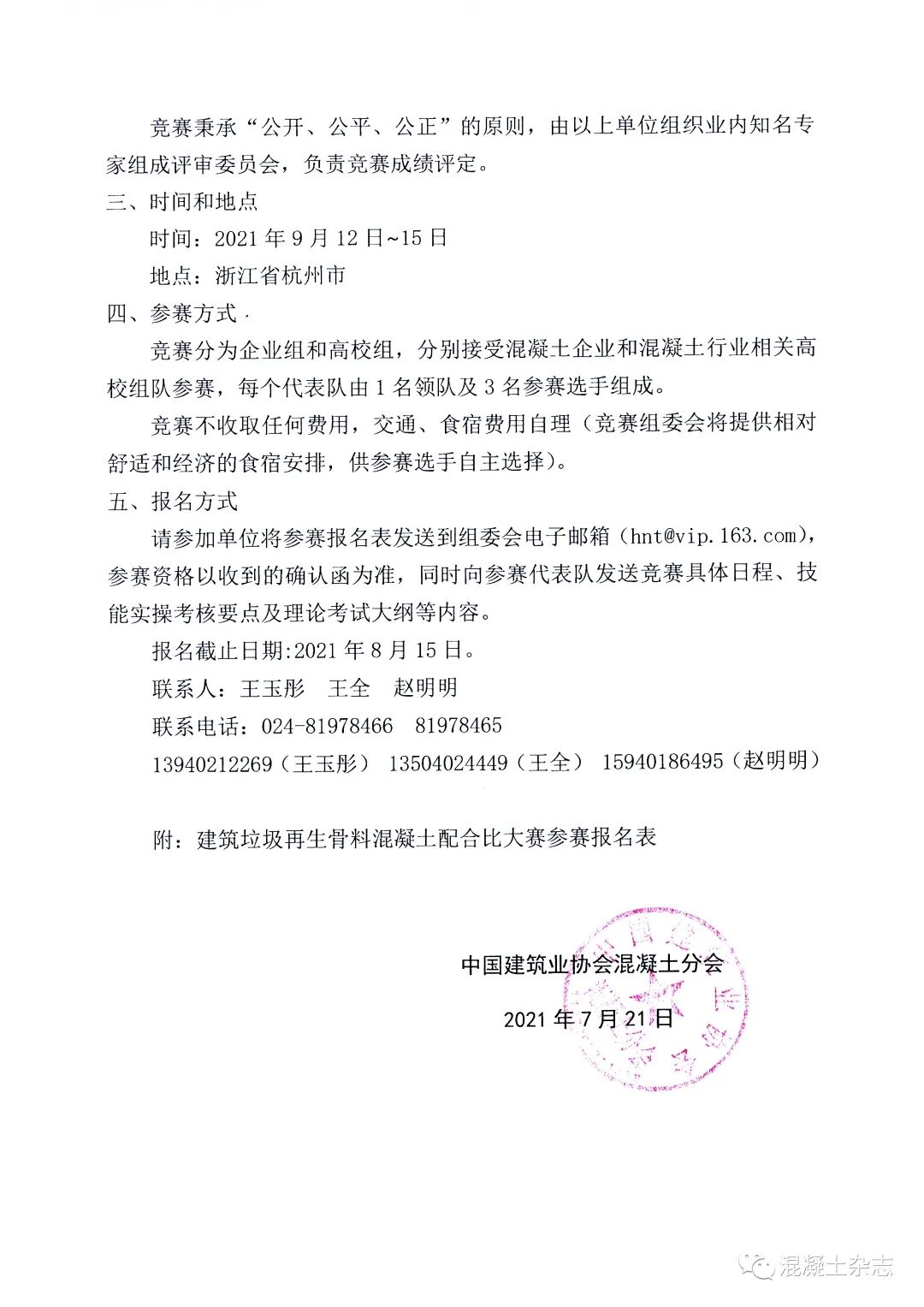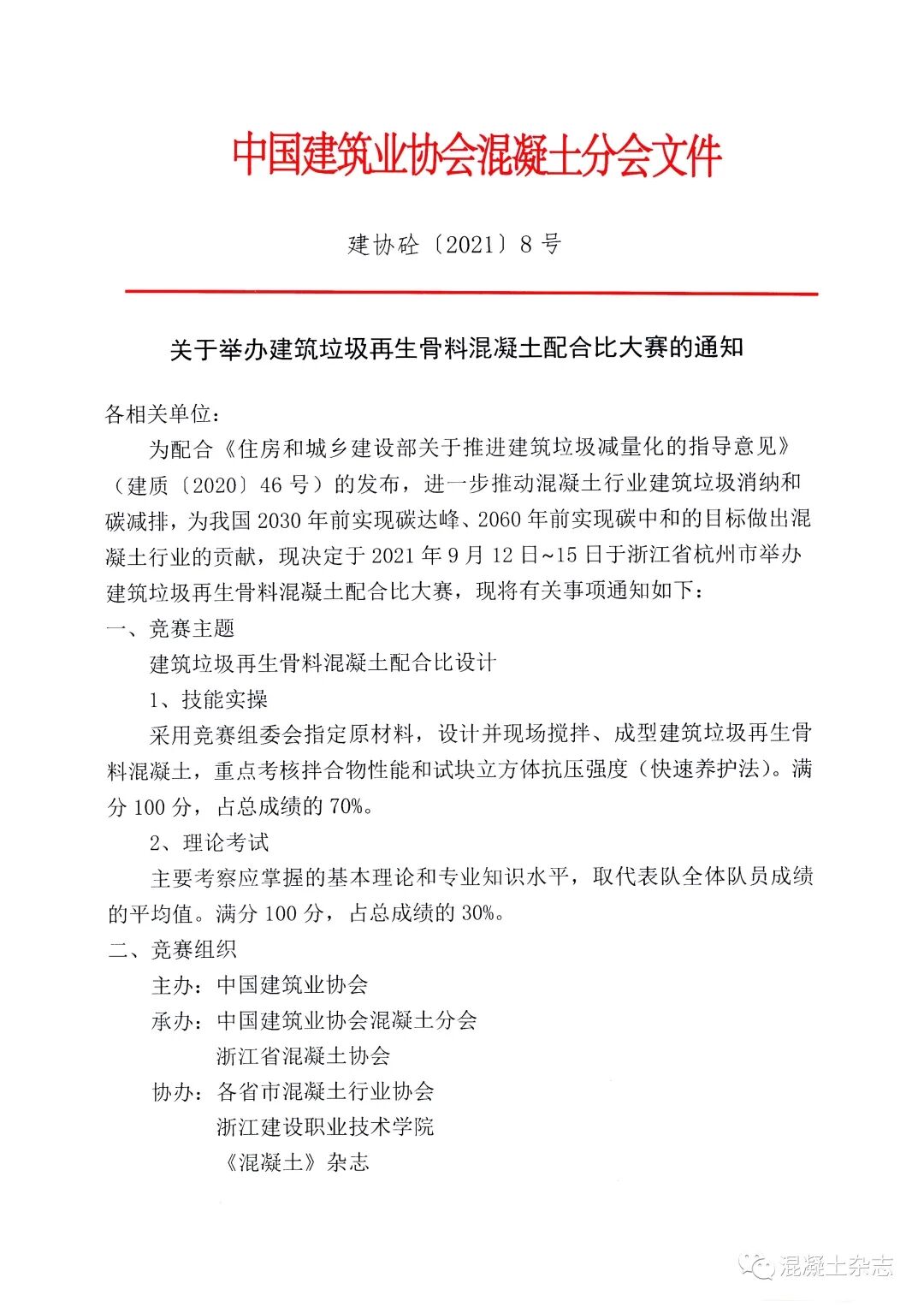 為配合《住房和城鄉(xiāng)建設(shè)部關(guān)于推進(jìn)建筑垃圾減量化的指導(dǎo)意見》(建質(zhì)〔2020〕46號)的發(fā)布,進(jìn)一步推動(dòng)混凝土行業(yè)建筑垃圾消納和碳減排,為我國2030年前實(shí)現(xiàn)碳達(dá)峰、2060年前實(shí)現(xiàn)碳中和的目標(biāo)做出混凝土行業(yè)的貢獻(xiàn),現(xiàn)決定于2021年9月12日~15日于浙江省杭州市舉辦建筑垃圾再生骨料混凝土配合比大賽。