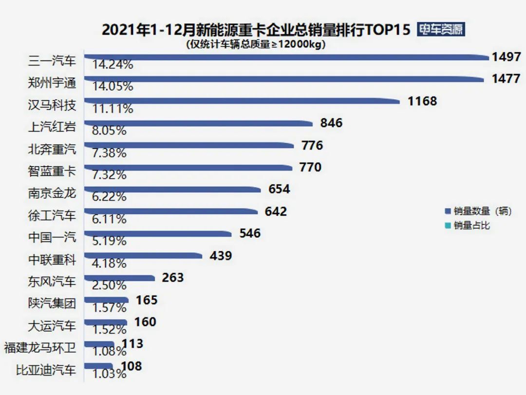 特別是在企業(yè)銷量排行榜上,表現(xiàn)最為搶眼的并不是傳統(tǒng)重卡制造商,而是工程機(jī)械企業(yè)跨行業(yè)進(jìn)軍重卡行業(yè)的典型代表——三一汽車與徐工汽車:三一新能源重卡2021年累計(jì)銷量達(dá)到1497輛,同比大增1621%,市場份額達(dá)到14.33%,較上年同期提升了11個百分點(diǎn);徐工在2022年1月21.2%的月度占有率火熱開局,問鼎新能源重卡2022首月銷冠。