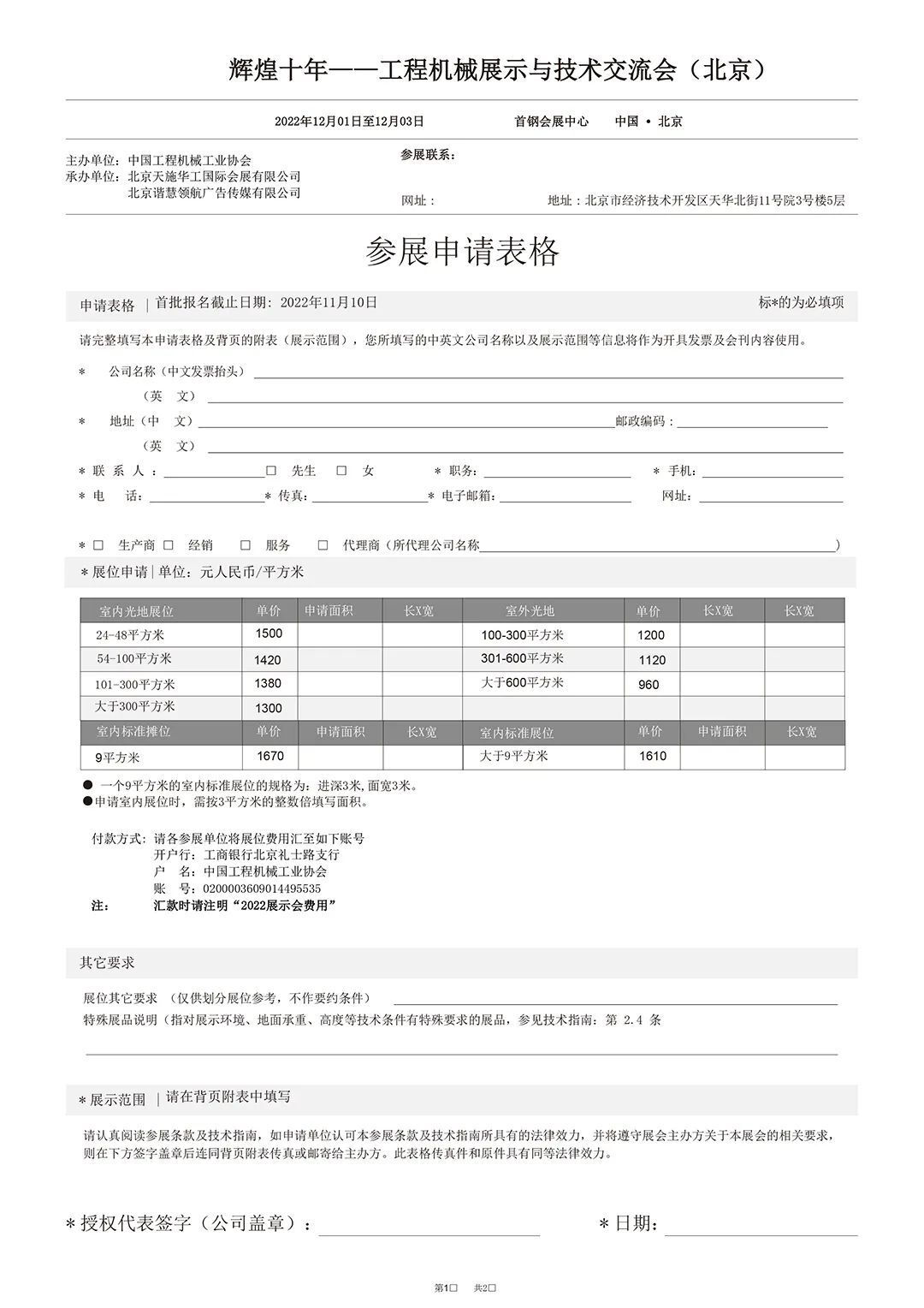 自協(xié)會發(fā)布舉辦“輝煌十年——工程機(jī)械展示與技術(shù)交流會(北京)”(以下簡稱“展示會”)通知后,得到了各參展單位的快速響應(yīng)和積極支持,有的已經(jīng)報名大面積參展,有的正在履行審批程序或來電表示參加展出,組委會深表衷心感謝!為及時傳遞展會信息,服務(wù)好廣大展商,辦好本次展示會,現(xiàn)向廣大展商正式發(fā)出邀請,并將有關(guān)展示會方案說明如下:一、為充分展示黨的十八大以來工程機(jī)械行業(yè)各領(lǐng)域取得的發(fā)展成就,協(xié)會研究決定召開本次展示會,邀請廣大協(xié)會會員和產(chǎn)業(yè)鏈上下游企業(yè)參展,共同分享企業(yè)發(fā)展成就和謀劃行業(yè)美好未來。二、展示會于2022年12月1日至3日在北京冬奧會滑雪大跳臺項目舉辦地——北京首鋼會展中心舉辦。屆時協(xié)會將邀請政府部門、相關(guān)用戶、媒體朋友和廣大觀眾到展示會現(xiàn)場參觀交流。12月3日(周六)實施社會公眾開放日,讓社會觀眾充分體驗工程機(jī)械發(fā)展魅力。三、北京首鋼會展中心適合舉辦室內(nèi)高品質(zhì)展示會,室外面積有限,而且適合承重較輕的產(chǎn)品展出。組委會初步規(guī)劃總展出面積2萬平米左右,希望各參展企業(yè)提供產(chǎn)業(yè)鏈上下游的先進(jìn)技術(shù)產(chǎn)品和高端裝備進(jìn)行展出,大型設(shè)備和示范工程應(yīng)用等可通過模型、圖片、視頻等方式展示。展示會主要目的是系統(tǒng)總結(jié)和全面宣傳十年來行業(yè)企業(yè)發(fā)展成就,參展方式可靈活多樣。四、組委會設(shè)定報名截止日期為2022年11月10日,以便統(tǒng)籌組織好運輸、布展和活動安排,高效推進(jìn)各項運營服務(wù)工作,確保展出效果。五、組委會將展館規(guī)劃為綜合類企業(yè)、專精特新企業(yè)、單項冠軍、高端重器、智能裝備、綠色產(chǎn)品、高端配套、先進(jìn)產(chǎn)業(yè)鏈供應(yīng)鏈等展區(qū),供各參展單位選擇。六、展示會期間組委會將舉辦“中國工程機(jī)械行業(yè)高質(zhì)量發(fā)展論壇”及其十多場系列會議、論壇和展示會選樹等活動。七、為便于展商報名和有序確定展位,本文隨附發(fā)布“展商報名表”、“展區(qū)規(guī)劃圖”、“展館示意圖”等,詳見附件。