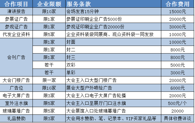 八、合作方式:我們誠(chéng)摯邀請(qǐng)并期待您的參與,合作方式包括但不僅限于:企業(yè)演講、參展證廣告、參觀證廣告、會(huì)刊廣告、戶(hù)外廣告位、注水旗、電子大屏、玻璃幕墻廣告、大會(huì)門(mén)樓廣告、禮品贊助、晚宴贊助等
