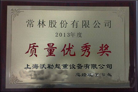 因常林股份公司在交貨期、產(chǎn)品質(zhì)量等方面的優(yōu)秀表現(xiàn),在知名的裝卸設備制造商上海沃勒起重設備有限公司2013年度供應商會議上,被評為優(yōu)秀供應商,榮獲質(zhì)量優(yōu)秀獎。