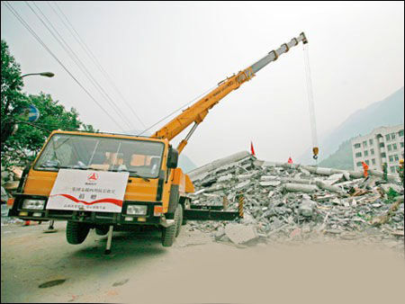 三一7臺(tái)挖掘機(jī)、8臺(tái)起重機(jī)以及80多名具有設(shè)備操作經(jīng)驗(yàn)的青年員工組成抗震救災(zāi)志愿者突出隊(duì),受命開(kāi)赴災(zāi)區(qū)。