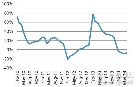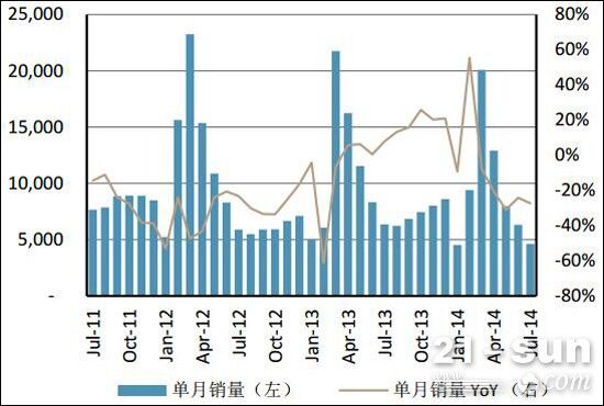 瑞銀表示,行業(yè)整體景氣度并未好轉(zhuǎn),下滑之勢未改。2013年4月開始,土方機(jī)械單月銷量增速由負(fù)轉(zhuǎn)正,其中挖機(jī)銷量在2013年四季度實(shí)現(xiàn)了超過20%的增長,裝載機(jī)在8月后亦實(shí)現(xiàn)了超過15%的月均銷量增長。但進(jìn)入2014年以來,由于房地產(chǎn)銷售及新開工不佳,2014年3月,挖掘機(jī)和裝載機(jī)銷量分別下滑8%和4%,結(jié)束了11個(gè)月的正增長。此后4-7月,跌幅持續(xù)擴(kuò)大,其中7月挖機(jī)銷量下降27%,裝載機(jī)銷量下滑20%。