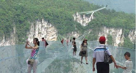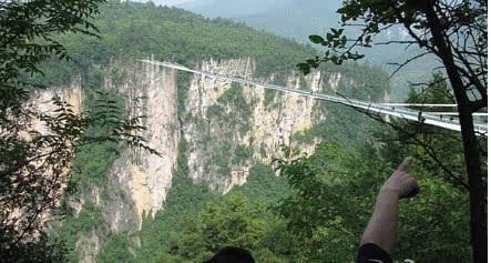 號(hào)稱世界最長(zhǎng)、最高的全透明玻璃橋———據(jù)遺產(chǎn)日?qǐng)?bào): 張家界大峽谷玻璃橋?qū)⒂?月向游客開(kāi)放。玻璃橋總長(zhǎng)430米、寬6米,橋面距谷底約300米,可站800人。整個(gè)工程無(wú)鋼筋混凝土橋墩,同時(shí)肩負(fù)蹦極、溜索、舞臺(tái)等多種功能。