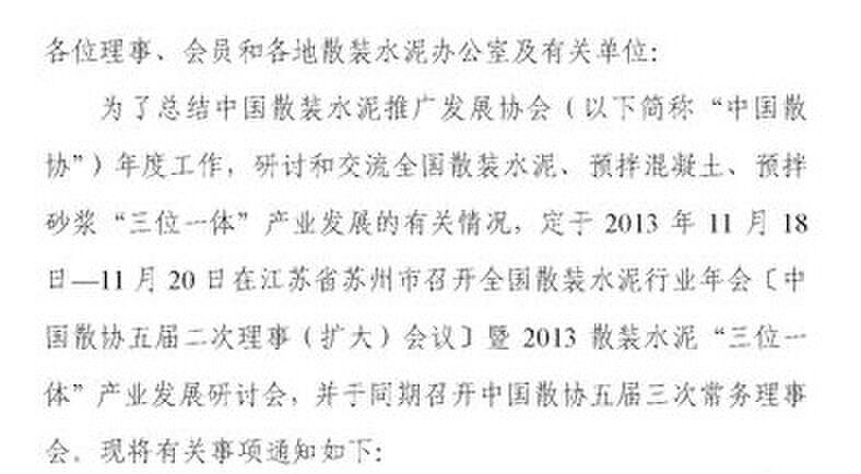 摘要:關(guān)于召開全國散裝水泥行業(yè)年會暨2013散裝水泥“三位一體”產(chǎn)業(yè)發(fā)展研討會的通知