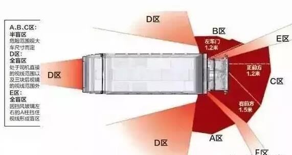 一般情況下,大貨車司機的視野可分為半盲區(qū)和全盲區(qū)。半盲區(qū)為左車門1.2米、右前方1.5米、正前方1.2米;全盲區(qū)為車正后方。