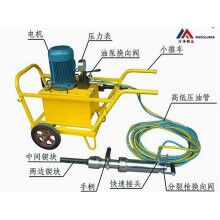 公路、鐵路修建遇巖石、城市、村寨需開挖房基遇巖石等狀況,石方很大的情況下,每個(gè)工作點(diǎn)可選用如下設(shè)備:鑿巖機(jī)3~4臺(配空壓機(jī)),液壓分裂機(jī)一臺(配2~3把劈裂頭),挖掘機(jī)一臺(配破碎錘)。具體操作如下:先將巖石上的泥土清理干凈,而根據(jù)巖石的紋理,在巖石上用鑿巖機(jī)鉆一組孔,每組孔以配劈裂頭的數(shù)量而定,孔距可根據(jù)不同巖石而定,一般在80cm~120cm左右,鉆好一組孔后立即將這組孔的巖石劈裂開,看劈裂的情況以便確定下一組孔的位置及方向。液壓分裂機(jī)有一個(gè)很重要的特性就是所劈裂體的劈裂位置要處于在兩邊對等相抗的位置上,不能一邊太薄而走漂。這樣劈裂的效果就不太明顯。一般情況下,所打的孔臨空面1米至1.5米就可以。劈裂深度亦視巖石的狀況而定,整體性越好劈裂深度就越深,可達(dá)2~3米。因液壓分裂機(jī)只能把巖石劈裂而不能將劈裂的石塊移出,而挖掘機(jī)的破碎錘又很難將山體上的巖石破碎,但液壓分裂機(jī)劈裂開的石塊又能輕而易舉將其移出,再將大塊的巖石破碎,易于裝卸。所以液壓分裂機(jī)與破碎錘配合使用既安全、效率又高。