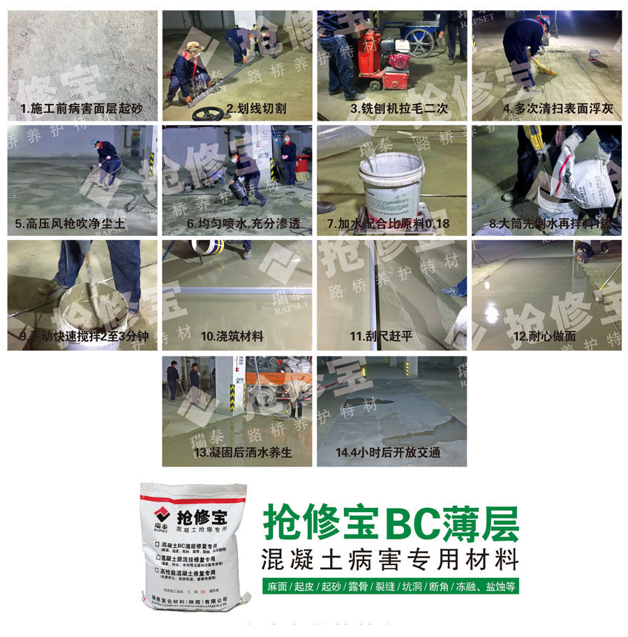 出現(xiàn)這些問題的主要原是因為施工質(zhì)量和產(chǎn)品本身的使用壽命問題,那么針對這種問題,地坪在修補處理基層時應(yīng)該選擇什么材料呢?首先應(yīng)考慮快速材料,因為是地下停車場,車輛需要頻繁進(jìn)入駛出;其次針對起塵、起砂、脫落的微表處病害,選擇針對微表處病害的修補材料。搶修寶BC薄層就是一個不錯的選擇,材料本身強度高,內(nèi)含進(jìn)口膠粉,可以和病害部位嚴(yán)絲合縫的結(jié)合起來,其次加入了進(jìn)口添加劑,材料可以30分鐘完成初凝,2-4小時就可以恢復(fù)交通,解決了車輛進(jìn)出頻繁引起的交通擁堵,是地坪修補基層處理的的不錯的選擇!