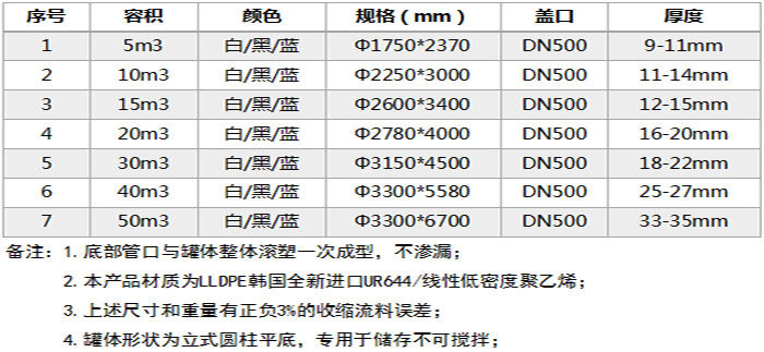特點(diǎn):所用材質(zhì)為韓國(guó)進(jìn)口聚乙烯(PE)滾塑原料,儲(chǔ)罐一次成型,內(nèi)外光滑,具有良好的衛(wèi)生性與抗紫外線能力,耐酸堿、耐腐蝕、易清洗、不易老化。它可以盛裝在常溫下無(wú)機(jī)酸、堿、鹽等大部分物質(zhì)及有機(jī)物,耐熱耐凍 耐熱耐凍性佳,-5℃—+85℃均可使用