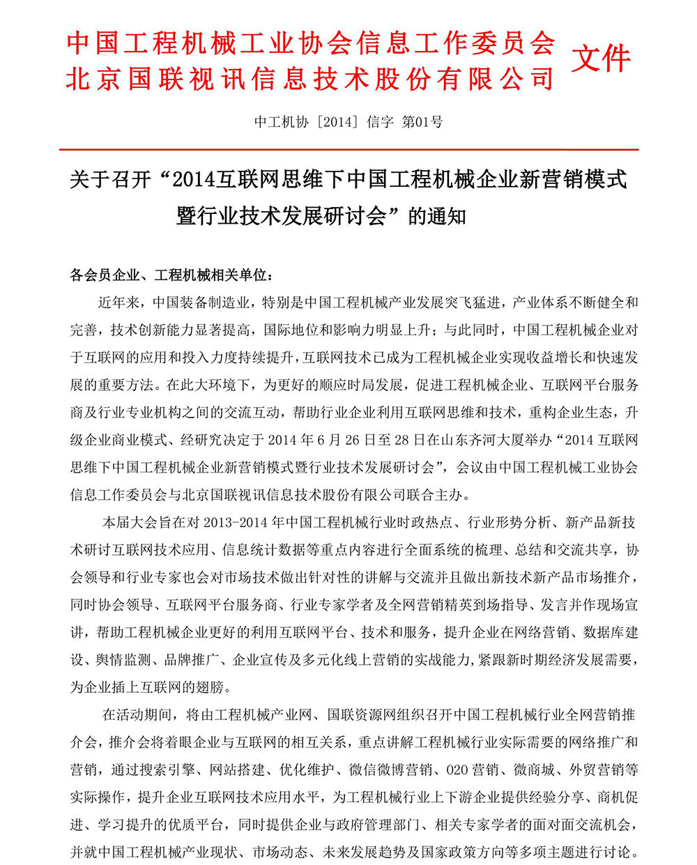 關(guān)于召開“2014互聯(lián)網(wǎng)思維下中國(guó)工程機(jī)械企業(yè)新營(yíng)銷模式暨行業(yè)技術(shù)發(fā)展研討會(huì)”的通知